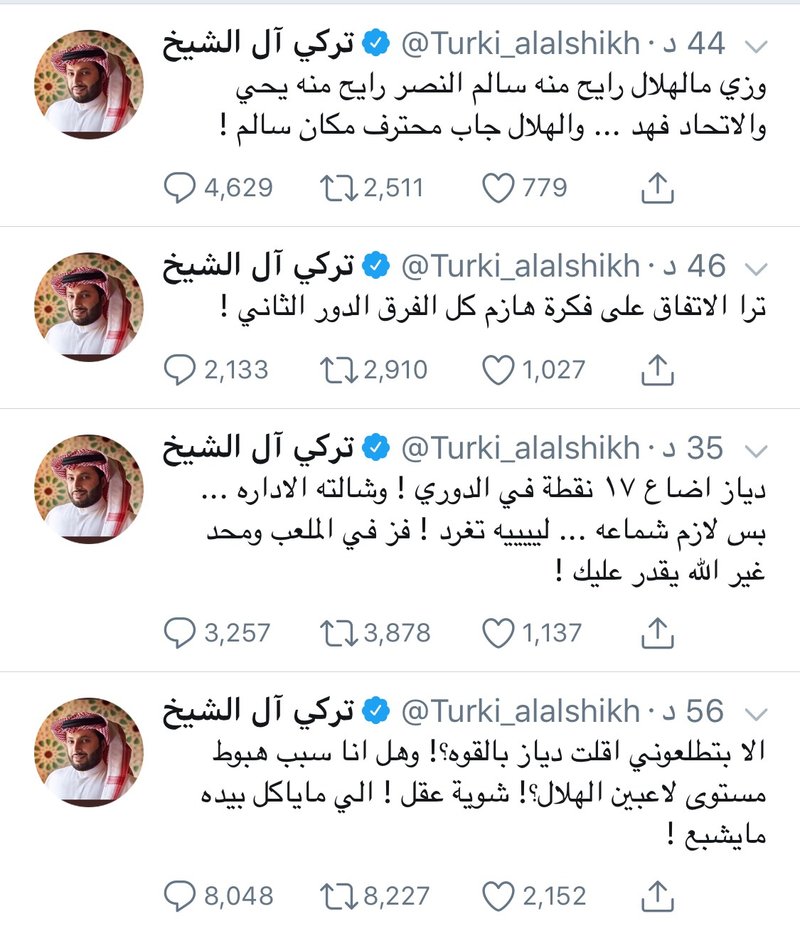 بعث تركي آل الشيخ، رئيس الهيئة العامة للرياضة، برسائل عدة عبر صفحته بتويتر معاتبًا فيها جماهير الهلال بشدة على خلفية هجوم الهلاليين عليه عقب خسارة الفريق أمام الاتفاق، واتهامه بأنه السبب فيما آل إليه وضع الزعيم.