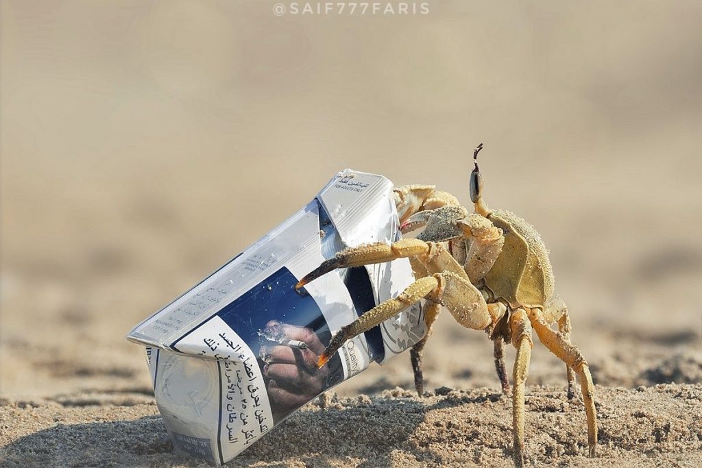 والصورة عبارة عن سرطان البحر يحمل علبة دخان، وقد ربط المصور بين سرطان البحر وما يسببه التدخين من أمراض منها مرض السرطان.