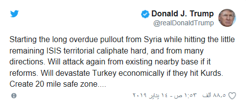 وكتب ترمب على تويتر: “سندمر تركيا اقتصادياً إذا هاجمت الأكراد. سنقيم منطقة آمنة بعرض 20 ميلاً”، مضيفاً: “وبالمثل، لا نريد أن يقوم الأكراد باستفزاز تركيا”.