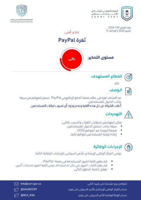 أصدر المركز الوطني الإرشادي للأمن السيبراني، اليوم الأحد، تحذيرا أمنيا عالي المستوى خاص بثغرة أمنية في نظام منصة الدفع الإلكتروني في (PayPal).