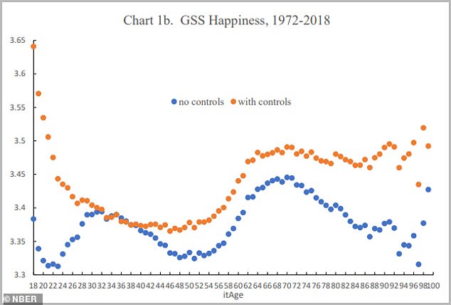 لكن هناك أمل، فمع مرور الوقت، ترتفع نسبة السعادة مرة أخرى بعد الستينات.