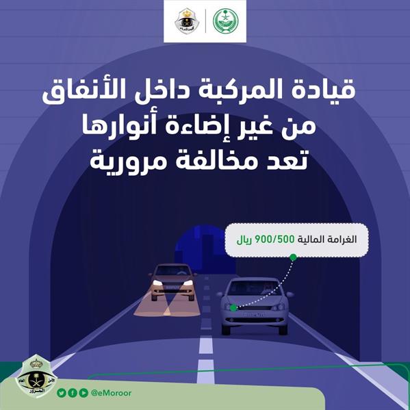 نبّه “المرور” قائدي المركبات بمختلف أنواعها إلى الحرص على إضاءة أنوار المركبة عند القيادة داخل الأنفاق، حتى لا تُسجل عليهم مخالفة مرورية.