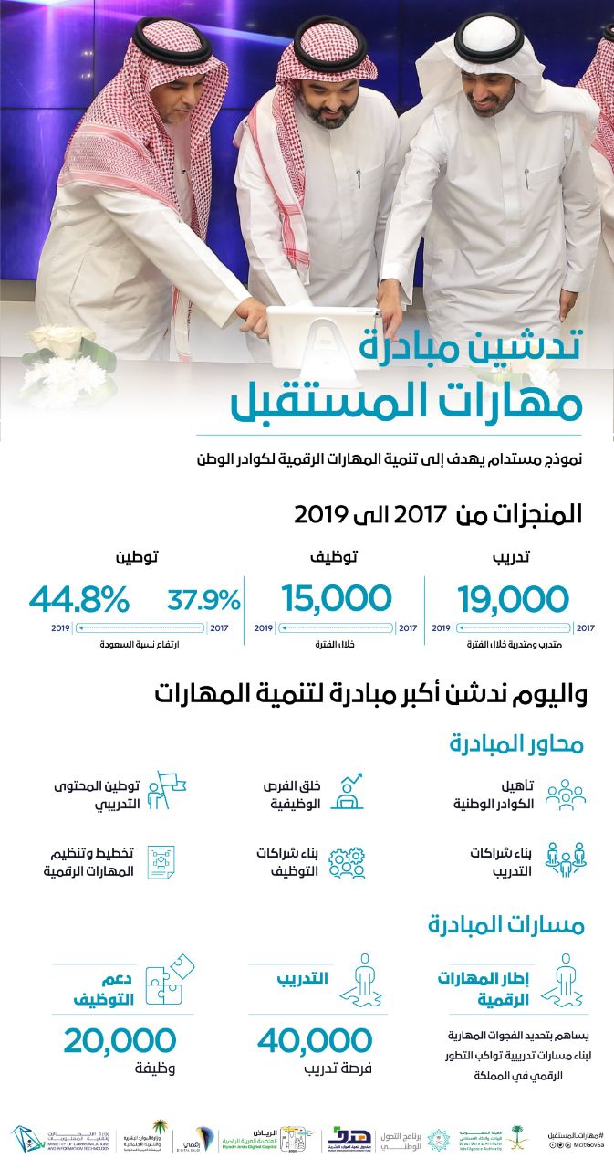 وتستهدف مبادرة “مهارات المستقبل” تدريب 40 ألف متدرب ومتدربة، ودعم توظيف 20 ألف في مجالات الاتصالات وتقنية المعلومات.