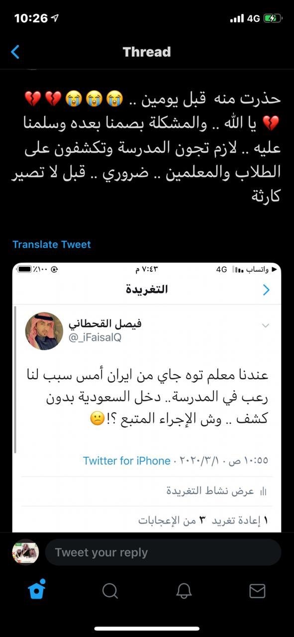شاهد.. هوية تغريدة المعلم القادم من إيران ” قطري أراد إفزاع المواطنين “