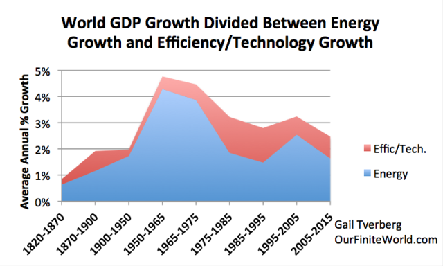 – النفط ما زال يعتبر أكبر وأهم مصدر للطاقة للاقتصاد العالمي، وهناك تناسب طردي بين معدلات استهلاك الطاقة وحجم الناتج المحلي الإجمالي العالمي منذ القرن الـ 19 وحتى الآن، ويبين الشكل التالي العلاقة بين نمو الناتج الإجمالي العالمي من جهة ونمو الطاقة والتكنولوجيا من جهة أخرى منذ عام 1820 وحتى 2015.