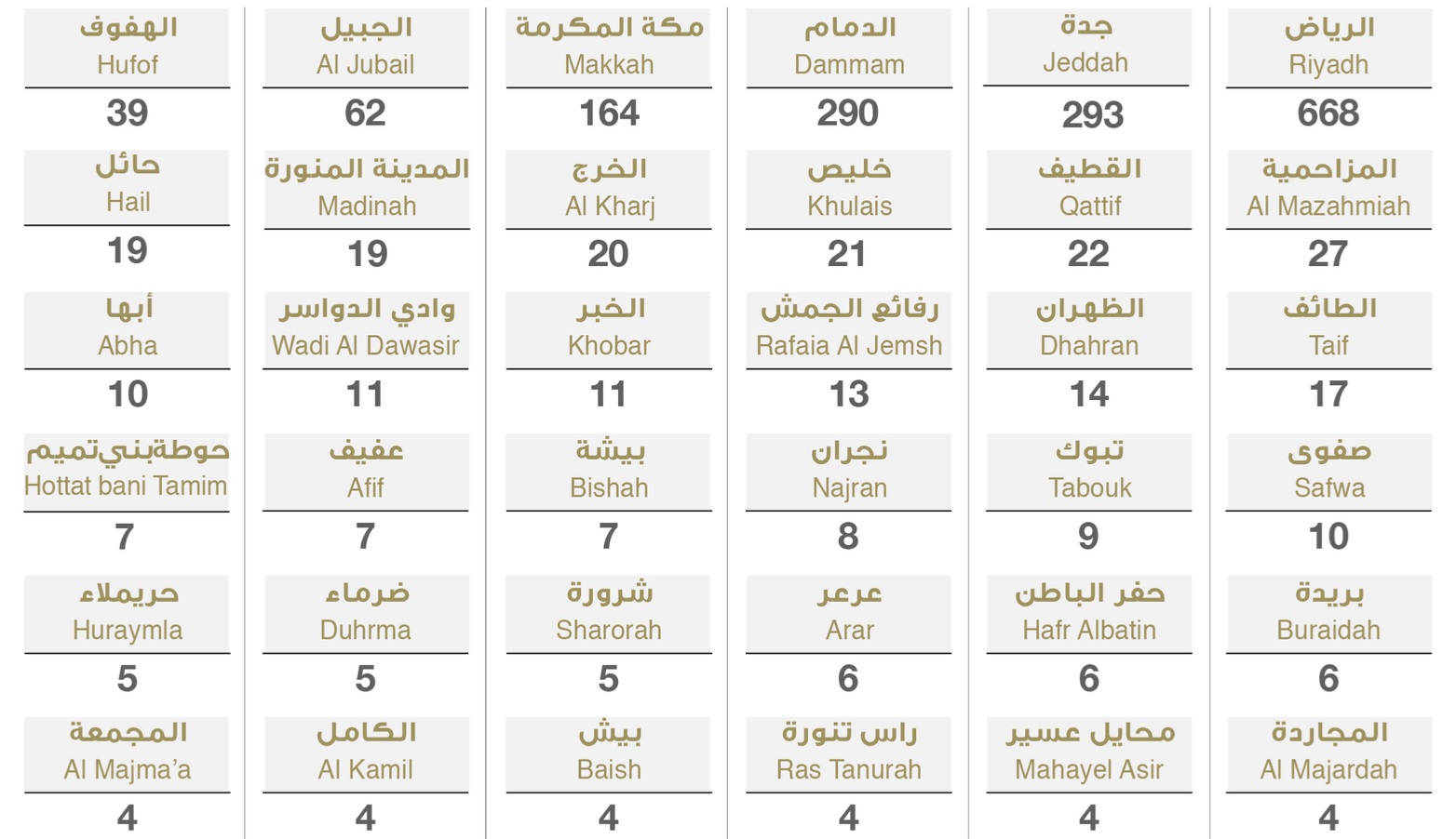 أعلنت وزارة الصحة اليوم الإثنين ١ يونيو ٢٠٢٠ عن 1881 حالات الإصابة الجديدة و عدد حالات الشفاء الجديدة 1864 حالة و 22 حالات وفاة جديدة و كان تعداد الإصابات بحسب مدن المملكة التالية :