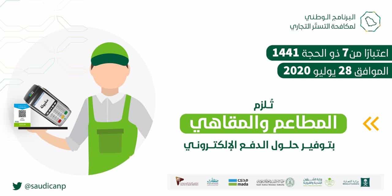 وقال برنامج مكافحة التستر: إنه ضمن الجهود الساعية لمكافحة التستر التجاري تم إلزام المطاعم والمقاهي بتوفير أحد حلول الدفع إلكترونيًّا ابتداءً من الشهر القادم.