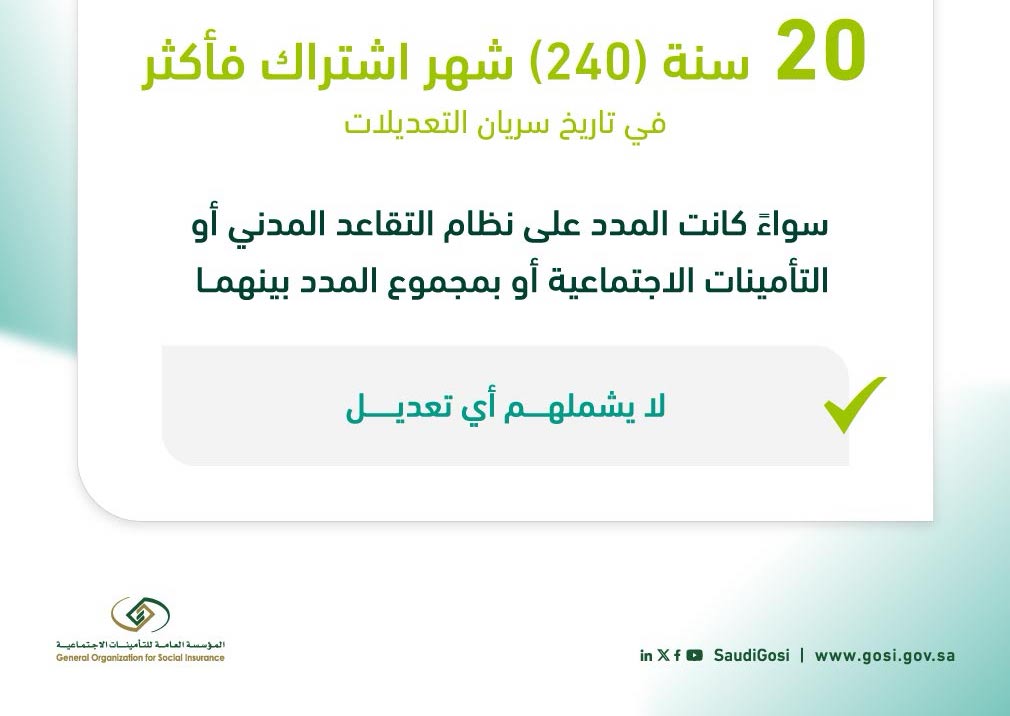 - من لديه مدد اشتراك 20 سنة (240) شهر اشتراك فأكثر سواء كانت المدد على نظام التقاعد المدني أو نظام التأمينات الاجتماعية أو بمجموع المدد على النظامين.