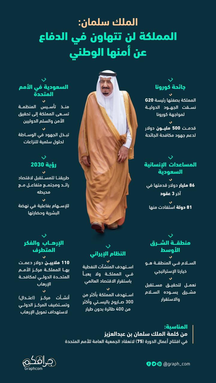 ألقى خادم الحرمين الشريفين الملك سلمان بن عبد العزيز مساء أمس (الأربعاء) كلمة بالدورة 75 للجمعية العامة للأمم المتحدة، تناول خلالها العديد من الموضوعات على الساحة العالمية والإقليمية.