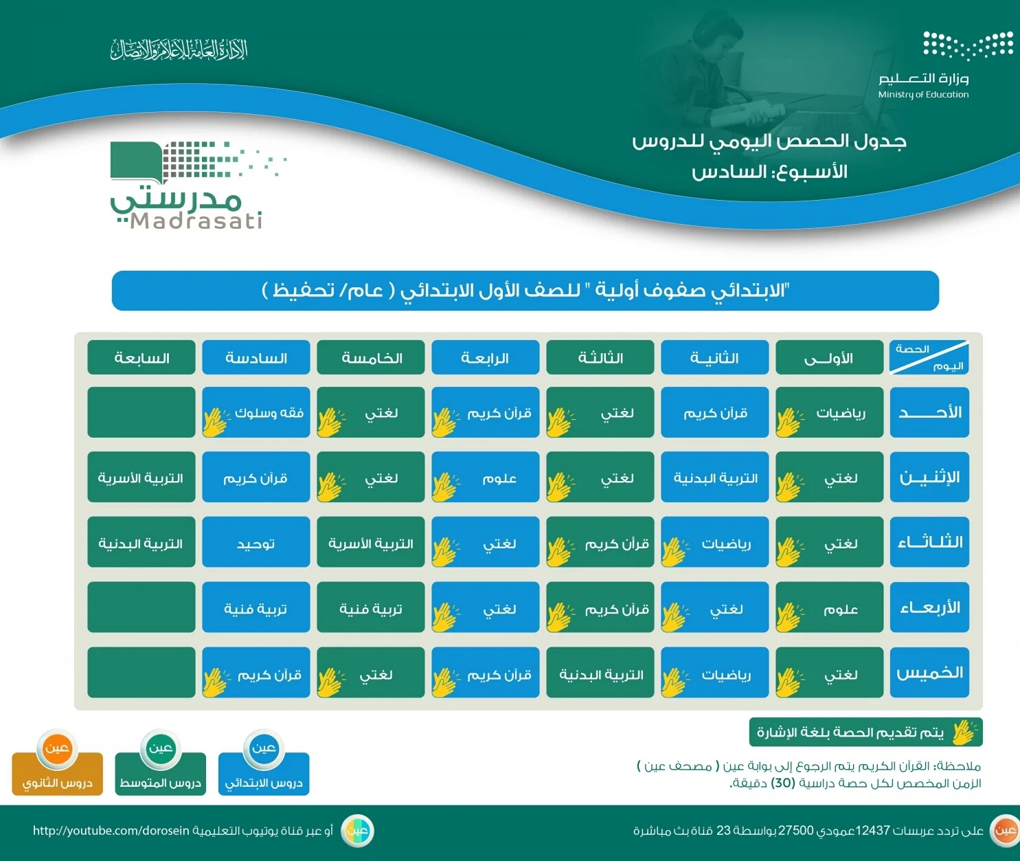 أعلنت وزارة التعليم عن جدول دروس الحصص اليومية للصفوف الأول والثاني والثالث الابتدائي من الأسبوع السادس، عبر قنوات عين على تردد عربسات 12437، في بث مباشر من الساعة 3 عصرًا، ويُعاد طوال اليوم، أو عبر رابط القناة على اليوتيوب: هنا.