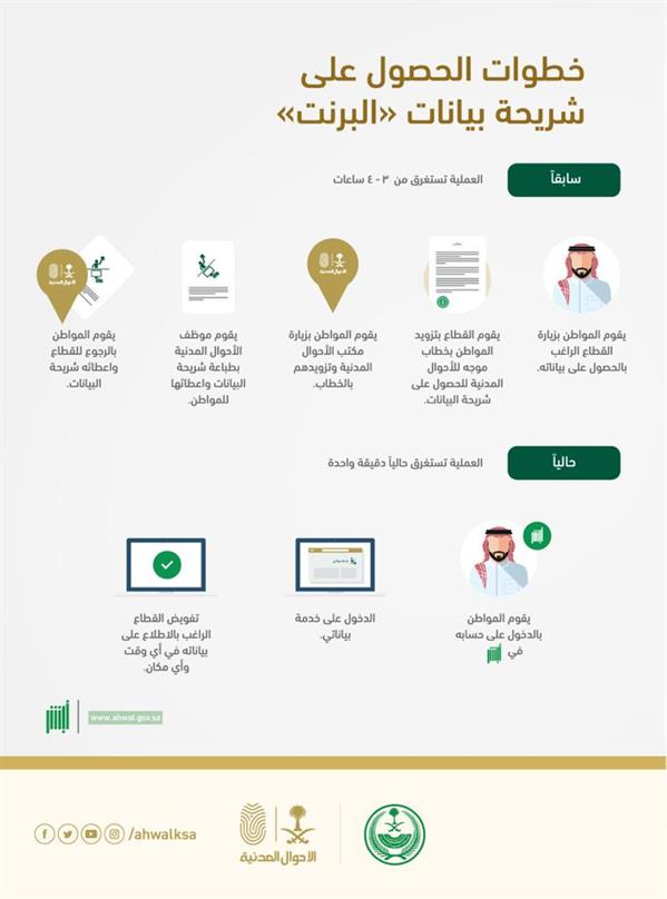 وأوضحت الأحوال أن المواطن في السابق كان يزور القطاع الراغب في الحصول على بياناته، ثم يقوم القطاع بتزويد المواطن بخطاب موجه إلى الأحوال للحصول على شريحة البيانات، وبعدها يزور المواطن مكتب الأحوال ويزودهم بالخطاب، ومن ثم يعود المواطن للقطاع لاستلام شريحة البيانات.