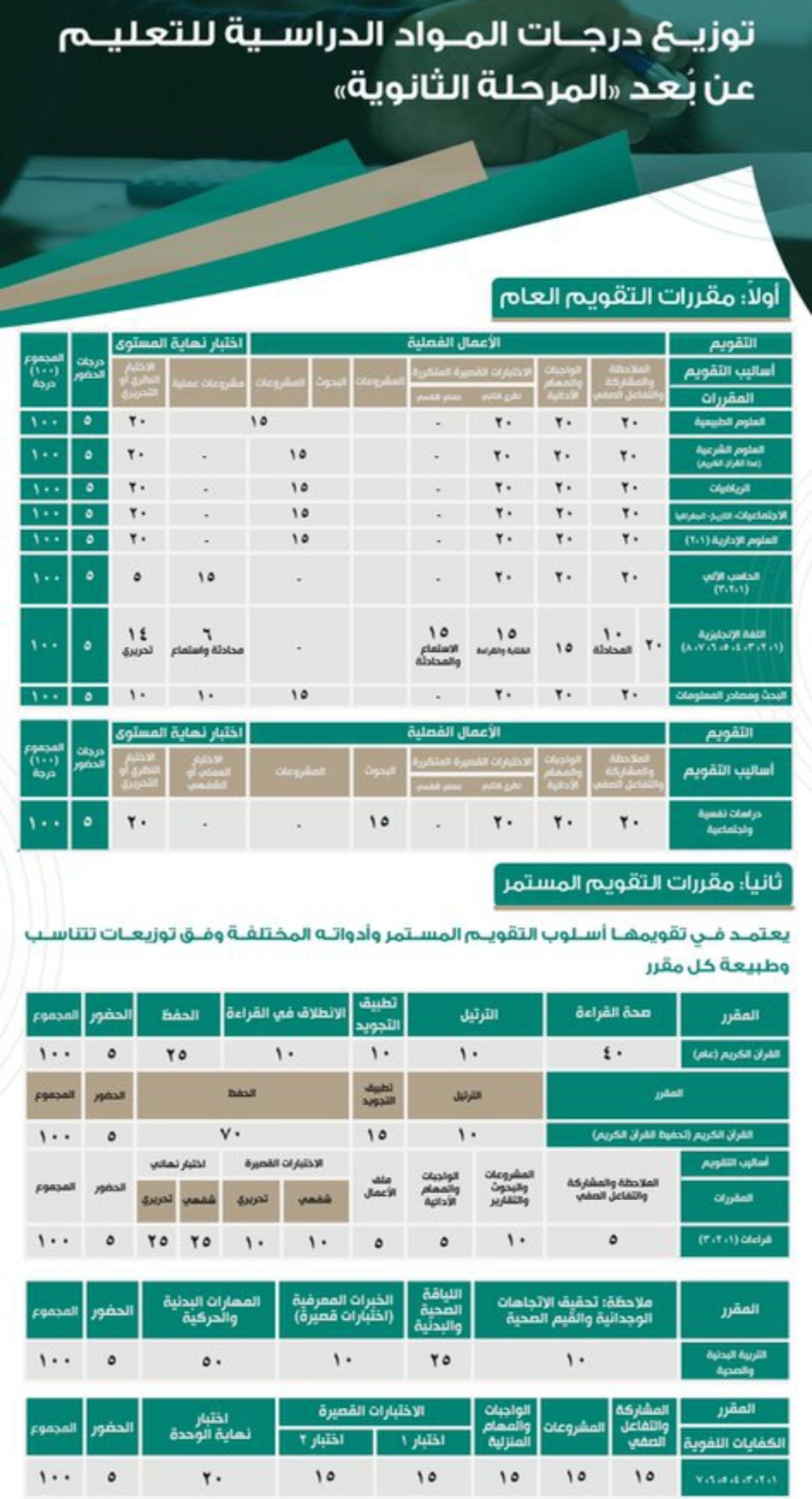 أولًا: إعادة توزيع درجات أعمال السنة والاختبارات النهائية لكل مادة دراسية استثناء للفصل الدراسي الأول معًا لتكون في المرحلتين الابتدائية والمتوسطة (٤۰ درجة) لأعمال السنة (اختبارات قصيرة، مهمات أدائية، مشاركات صفية واجبات منزلية) و(1) درجات للاختبار النهائي، والمرحلة الثانوية وفق الجدول المرفق.
