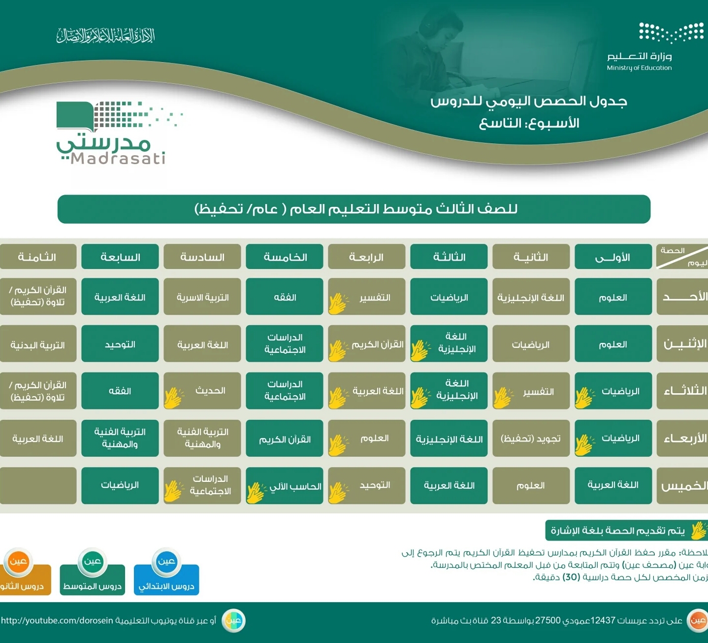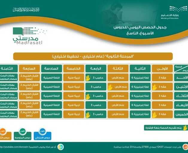 وأيضًا أعلنت عن جدول دروس الحصص اليومية للصفوف (الأول والثاني والثالث المتوسط) من الأسبوع التاسع، عبر قنوات عين على تردد عربسات 12437، في بث مباشر من الساعة 9 صباحًا، ويُعاد طوال اليوم، أو عبر رابط القناة على اليوتيوب: هنا.