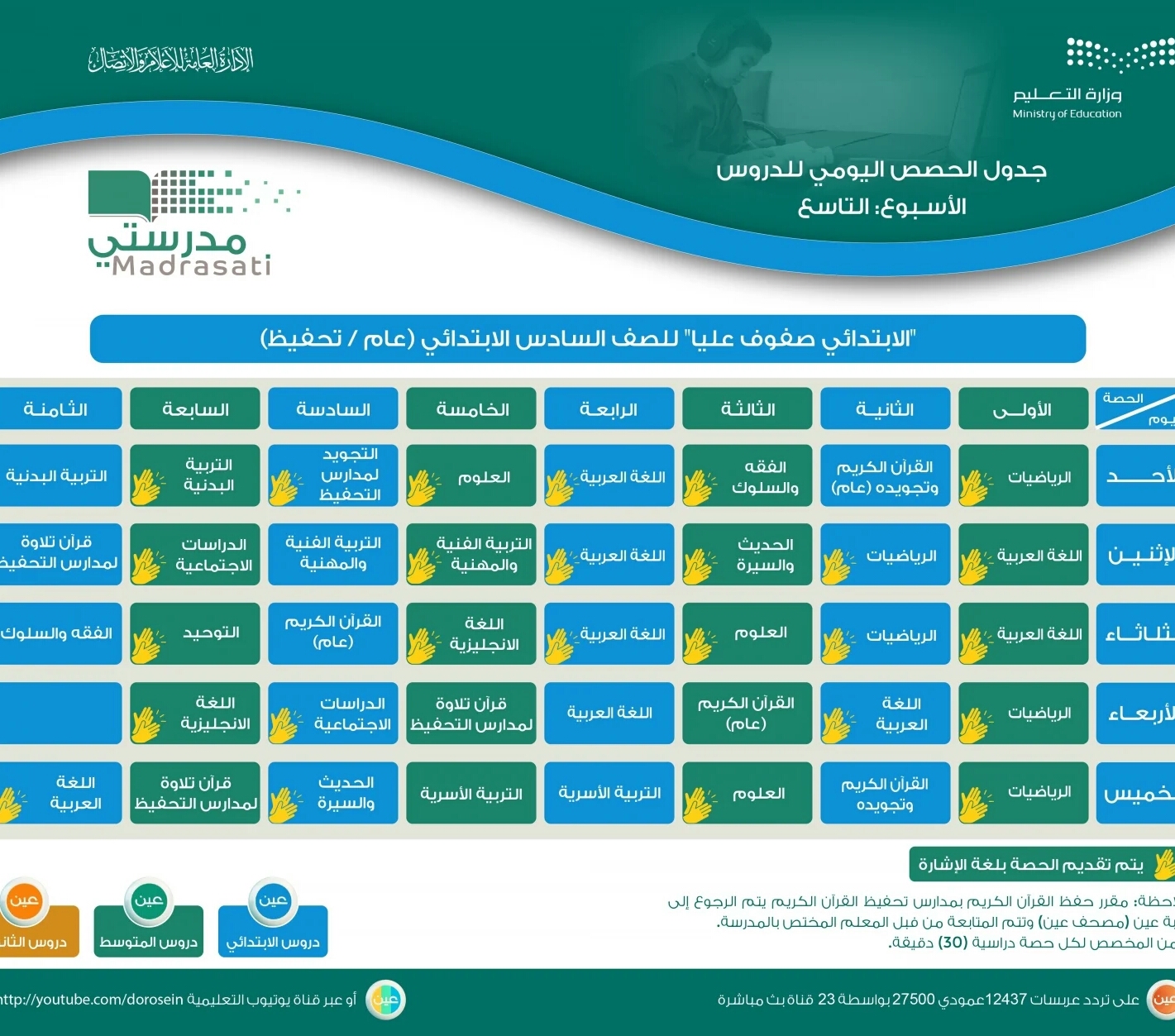 أعلنت وزارة التعليم جدول دروس الحصص اليومية للصفوف (الأول والثاني والثالث الابتدائي) من الأسبوع التاسع، عبر قنوات عين على تردد عربسات 12437، في بث مباشر من الساعة 3 عصرًا، ويُعاد طوال اليوم، أو عبر رابط القناة على اليوتيوب: هنا.
