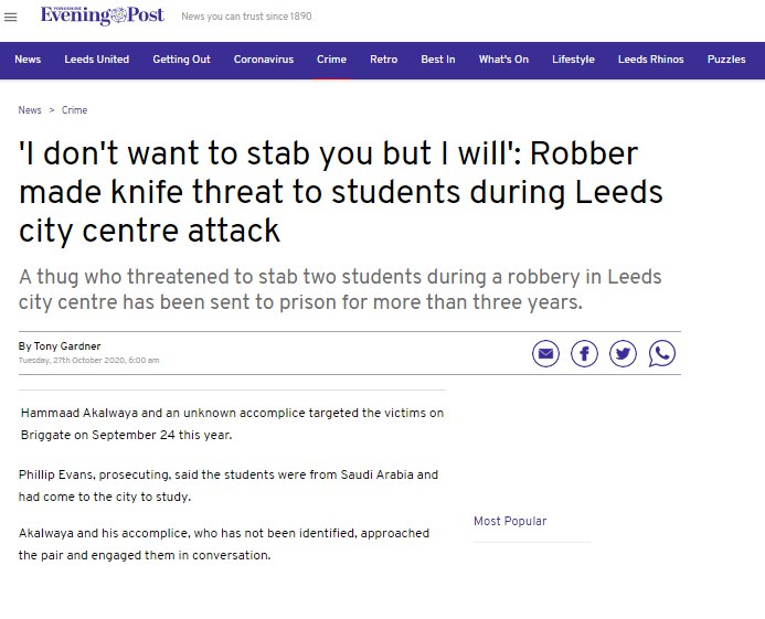 وقال المدعي العام، فيليب إيفانز، إن طالبَين من السعودية قد جاءا إلى المدينة للدراسة، تعرضا لعملية سرقة ومحاولة طعن من قبل حماد أكالوايا وشريك مجهول في 24 سبتمبر من هذا العام.